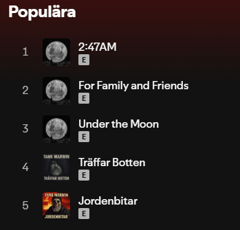 My two new swedish language tracks have soared up into my top five. The three most popular tracks from Under The Moon still hold the top position though. I wish more people got to hear Under The Moon, it’s an excellent album.